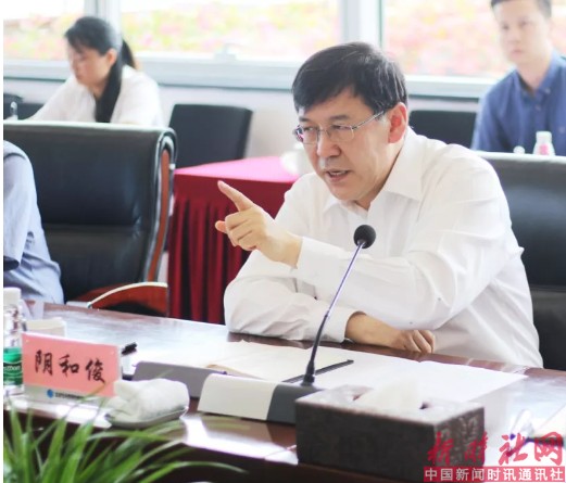 在会议室,阴和俊观看了企业宣传片,并与集团领导班子成员进行了座谈交流。
