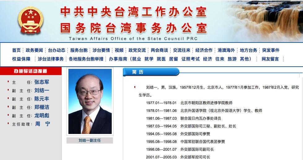 刘结一任中共中央台办、国务院台办副主任(正部长级)。