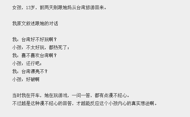 从头到尾看了一遍,小熊喵还是觉得感慨万千。其实不同年龄段大陆人对台湾的看法何尝不是一部大陆发展史缩影呢,积贫积弱的时候我们羡慕台湾的富裕,人情冷漠的时候我们羡慕台湾的人情味,当我们和台湾的发展差距拉大的时候我们已经可以云淡风轻地不那么在意台湾了。