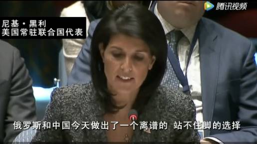 美国常驻联合国代表说:俄罗斯和中国今天做出了一个离谱的、站不住脚的选择,他们拒绝让巴沙尔。