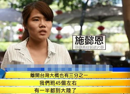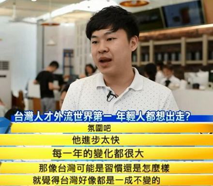 台当局还有一项统计的数据显示,到2015年,在约有1000万人的台湾劳动力中,超过72万人的目光不再局限于台湾,将找寻更好工作机会的目标看向了大陆以及其他国家,其中更有72.5%的人拥有大学以上学历,他们中有的说在台湾工作看不到机会和未来: