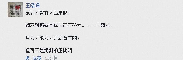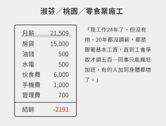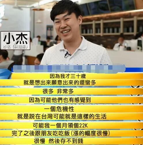 我们可以清楚地看到,就算平均月薪到了30K,这位工作了24年的厂工也仅仅是刚刚够生活,更不用提将调升的月薪还仅仅是至22K了yes123求职网发言人杨宗斌表示,对30多岁的台湾青年劳工来说,月薪还不到3万元,前途、钱途皆茫然;而40岁以下的劳工自认是月光族的比例高达1/3,其余66%的人,平均每月仅存8814元。