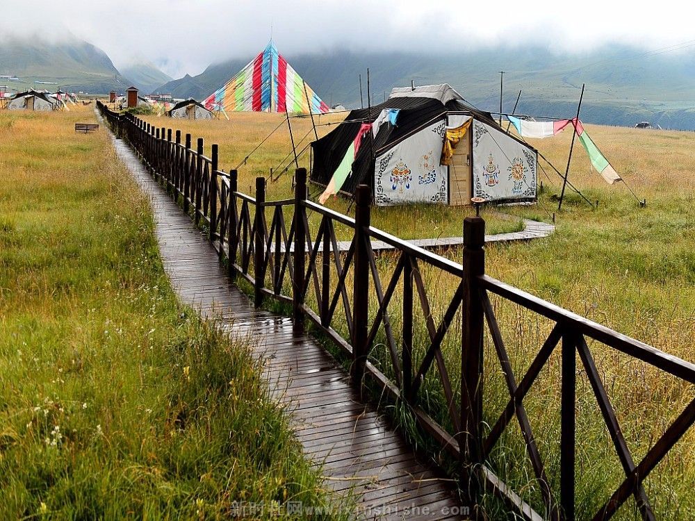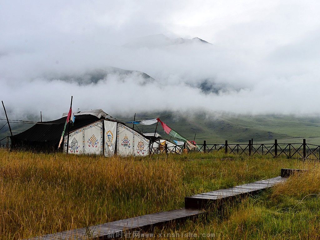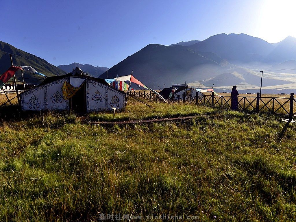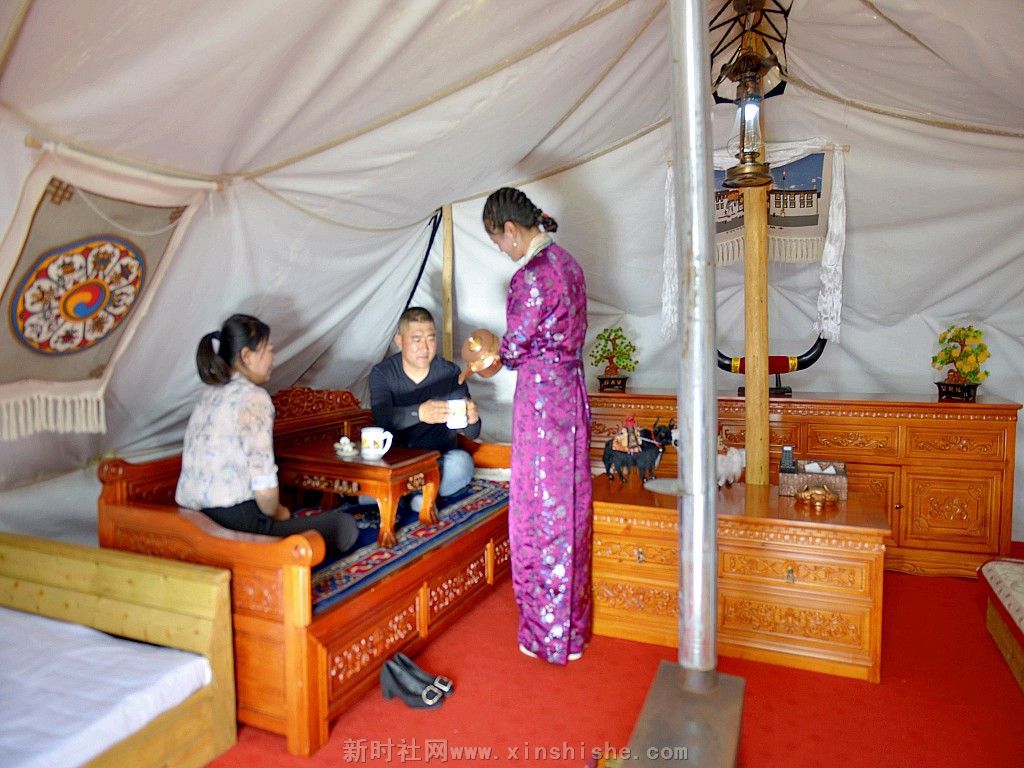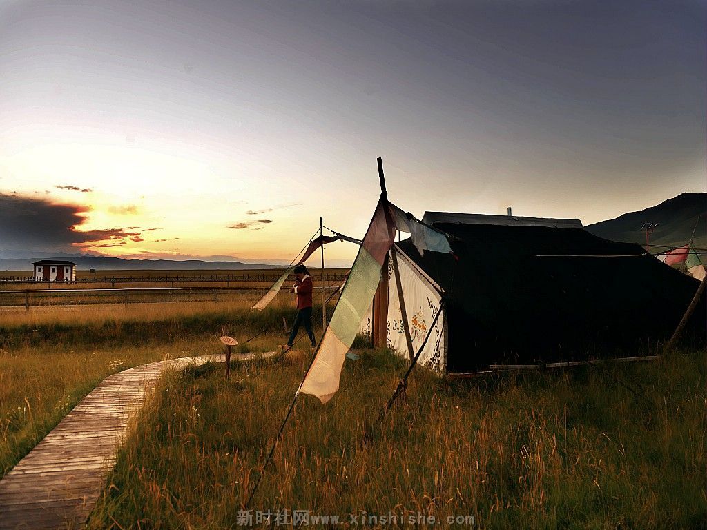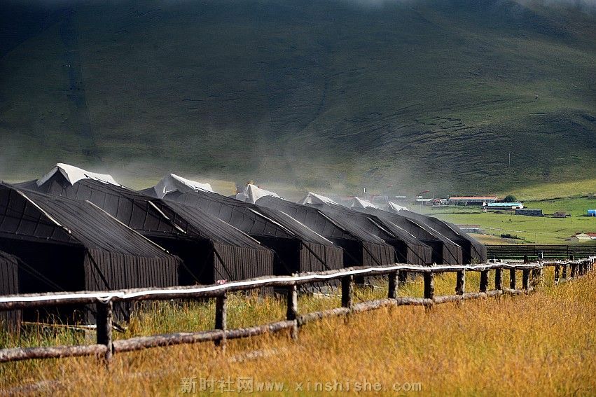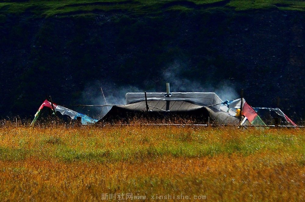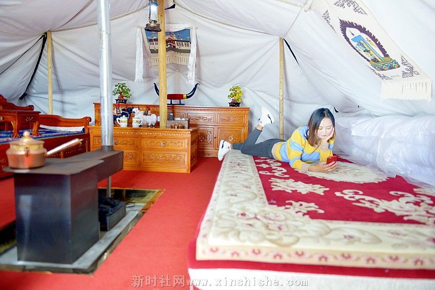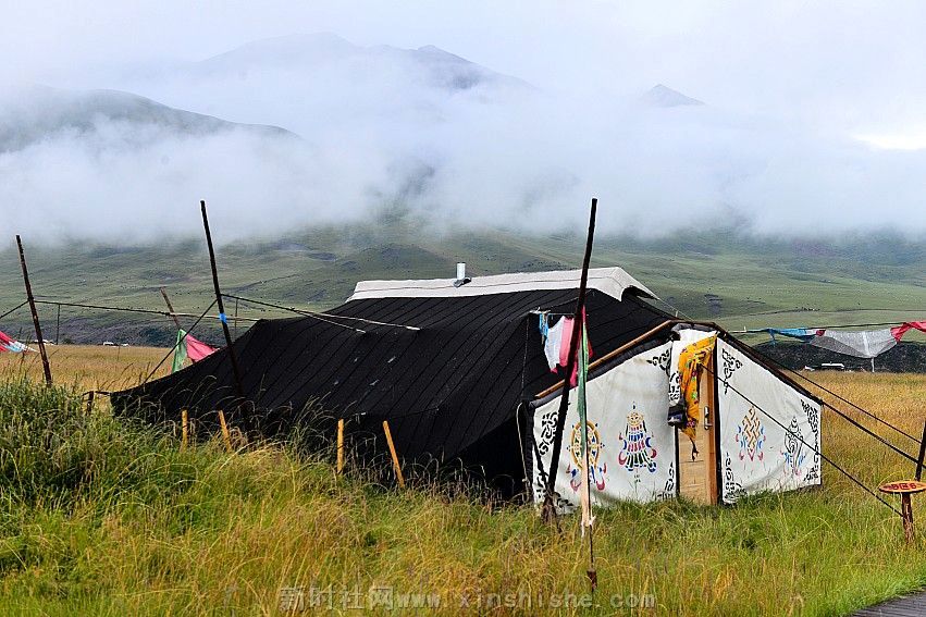 一顶黑帐包涵着人们的向往、信仰和生活,而它的制造过程是这样的:男人剪下牛毛,女人把牛毛捻成线,织成厚厚的毛制品,然后男人们以虎口尺也叫卡衡量长宽缝制而成,最后选个吉祥的日子,把它支起来,摆宴庆祝一番,一个温暖的新家就这样诞生了。这种帐篷中间是十五对子母扣,藏语叫“松阿”;帐内的八个撑杆象征着八瑞相,也叫八吉祥徽;帐外有十一个撑杆,其中帐后的撑杆必须是桦木,桦木在藏语中与“常性”的“常”谐音,具有幸福常存的意思,帐前撑杆必须是柏木,预祝帐前牛羊繁盛;帐篷内外共十九个撑杆,二十八根橛子环帐,四十一根长短粗细不一的绳子和三十个木栓相扣等组成。帐篷大小不一,一般中等帐篷前后五弓一卡,左右五弓一肘,约有四十平米左右。天窗帘子和帐篷护边都要用羊毛或白色牛绒纺织
