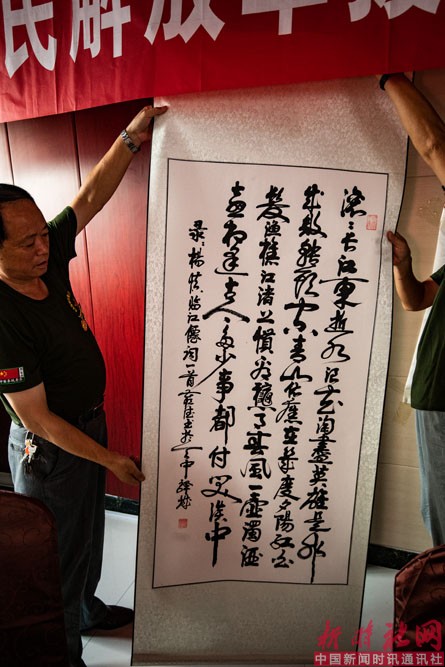 五支队医院战友曹恒德,特意书写了一幅“滚滚长江东逝水……”中堂字画献给大会,向老战友们表示祝贺,并发表了如何当一个有家庭政治智慧的老人的演讲,他说出了战友们的心里话,解决了部分老战友不会处理家庭关系,不能安度晚年的心结。接着每位参会战友都在中国援老老兵旗上郑重签下了自己的名字,并合影留念。
