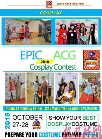 新时社网特约记者阿丹消息:第五届环球动漫游戏节(Epic ACG Fest)将在旧金山东湾伯克利加大分校附近举办,10月27, 28曰两天, 将放映来自15个国家的42部优秀动画电影,展览漫画作品, 提供桌面游戏比赛, cosplay 角色扮演比秀。环球动漫游戏节每年的时间都在美国的传统万圣节季节里, 万圣节装扮红毯秀让其成为全球独一无二的好莱坞风格的极客文化盛会,参加的全家老小一起过一个安全的,有趣,有特色的万圣节。