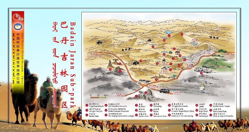 因此,巴丹吉林沙漠世界级探险旅游基地的开发,具有巨大的发展潜力。2005年巴丹吉林沙漠成为阿拉善国家级沙漠地质公园核心区,被中国地理杂志评选为“中国最美丽的沙漠”,被众人誉为“上帝划下的曲线、苍天缔造的神奇”。2006年,又入选“中国最值得外国人去的50个地方”之一并荣获金奖,被国家旅游局和中国科学探险协会联合推荐为全国首批十七个最具代表性的探险旅游区之一。巴丹吉林名称来历有几种说法:一说巴丹是由“巴岱”演变而来,而巴岱系蒙古语,为一地名,吉林是由“吉吉让”演变而来,而“吉吉让”是藏语,意为地狱;二说巴丹吉林系蒙古语,巴丹同样是由巴岱演变而来。巴岱是人名,几百年前有一名叫巴岱的人在此居住,吉林是数词,即六十。当时在这片大沙漠中最初发现六十个湖泊。巴丹吉林是由巴丹与吉林二词组成,前者为人名,后者为数词;三说据说,从古梵语译成的甘珠尔经(大藏经)第十三卷(又说十二卷)里记载巴丹吉林之名称来历的典故。这个材料无疑是很宝贵的,但因缺乏详细的调查说明,有待考究。巴丹吉林传说 在很早以前,有个叫巴岱的牧人,在这一望无际的大沙漠中发现很多(“吉林”蒙古语,六十个)湖泊,就此,他就把家迁到这里,游牧生息一代又一代,故后人以巴岱命名了这个大沙漠——巴丹吉林(意为巴岱之湖泊)。相传很古的时候,有个邬尔章国都巴当城就坐落在现在的巴丹吉林这块地方,当时这里没有什么大沙漠。邬尔章国臣民安居乐业,一代传一代地过了多少个世代,除了国王谁也说不清楚。就在邬尔章国第九十九代国王的时候,相传很古的时候,有个邬尔章国都巴当城就坐落在现在的巴丹吉林这块地方,当时这里没有什么大沙漠。邬尔章国臣民安居乐业,一代传一代地过了多少个世代,除了国王谁也说不清楚。就在邬尔章国第九十九代国王的时候,出了一个黑心的宰相,他就是混世魔王。这个奸臣,为了暗算国王,他把女儿乌拉玛斯嫁给了国王的太子。不久,国王仙逝,太子继位当了国王。这个当国王的太子是个游手好闲、不学无术的家伙,哪知道管理国家大事呢?他只知道天天吃喝玩乐,用牛奶给乌拉玛斯洗澡,一切权利全掌握在岳父混世魔王手中。从此,国民多灾多难,生活在水深火热之中,这样,便激怒了九天。九天为惩罚混世魔王,先下起了五谷和奶雨,挣扎在水深火热中的国民得救逃离了邬尔章国, 后又下了七天七夜的倾盆大雨,城廓围变成一片汪洋;最后,又刮了七天七夜的黄沙,埋掉了邬尔章国的国都巴当城。从此,后人将这个大沙漠叫巴丹吉林。巴丹吉林具有奇特、别致的景观,是探险、观光、以及进行考古和沙漠研究的理想之地。自1984年以来,先后有法、日、美、奥地利、新加坡等国家及国外许多专家学者前来考察,获得了大量有价值的数据和资料,发现了驼鸟蛋和古动物化石,包括恐龙化石。在沙漠腹地的湖泊周围还发现了大量的新石器和旧石器,其中有石器碎片和色粗陶片。经考古分析,是3000——5000年前人类活动的遗迹,有很高的研究价值。1996年德国探险旅行家包曼出版了《巴丹吉林沙漠》一书,轰动了欧洲。1998年3月在美国召开的国际探险旅游博览会上中国唯一推出的项目就是巴丹吉林沙漠旅游线路,引起外国旅游部门极大的关注。巴丹吉林沙漠风光已经进入美国ZNTERNET计算机信息网,沙漠旅游业发展前景十分广阔。2002年以来,随着国际旅游、观光、探险热的兴起,巴丹吉林沙漠吸引了许多中外游客,来自美国、英国、德国、澳大利亚、韩国、挪威、奥地利、加拿大、日本、爱尔兰等国家的多位友人前来徒步探险旅游、科学考察。原始、空旷、与世无争的宁静与奇妙的沙漠风光,令中外友人流连忘返。2004年英国KEO电影公司摄制组一行七人在世界著名电影导演多米尼克·贝茨和节目主持人尼克拉斯·米德尔顿的带领下,深入到巴丹吉林沙漠拍摄以宣传大漠、驼铃、夕阳、月夜、风土人情为主要内容的记录片《极限之行》。在时世沧桑变迁中,巴丹吉林始终以其雄伟神奇震撼着人们的灵魂和精神。大自然的神奇力量造就了自然界的奇趣魅力,越来越多的人走进巴丹吉林沙漠的深处探索人类从未踏足过的秘境。 1、 巴丹湖 巴丹湖是巴丹吉林的门户,离旗府约90公里,距离金昌约150公里,离317省道20公里。整个巴丹湖由13个小湖组成,水域总面积为138亩。其中有淡水湖,可以开展垂钓、游泳、沙雕等活动。巴丹湖周围高沙 1、 巴丹湖 巴丹湖是巴丹吉林的门户,离旗府约90公里,距离金昌约150公里,离317省道20公里。整个巴丹湖由13个小湖组成,水域总面积为138亩。其中有淡水湖,可以开展垂钓、游泳、沙雕等活动。巴丹湖周围高沙林立,鸣沙遍地,最高沙山海拔为1538米,可以开展攀登、滑沙、沙漠冲浪、体验鸣沙、沙疗、滑翔等活动。巴丹湖可以说浓缩了巴丹吉林景观的精华,适宜开发大众旅游。巴丹湖区还是锁阳盛产地,每年春季,待锁阳头露出地面,此后开花结籽,火一般铺遍绿洲,甚是壮观。这里雄壮高大的沙山纵横交错、群峰耸峙、陡峭峥嵘、此起彼伏。秀美的湖泊如同湛蓝的夜幕上缀满了宝石般的星辰,