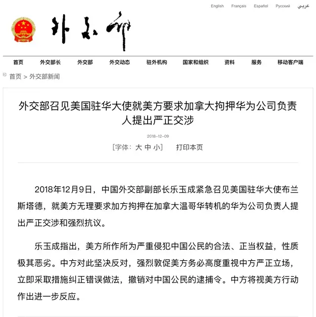 2018年12月9日,中国外交部副部长乐玉成紧急召见美国驻华大使布兰斯塔德,就美方无理要求加方拘押在加拿大温哥华转机的华为公司负责人提出严正交涉和强烈抗议。