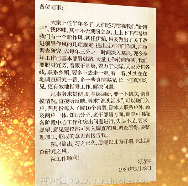这是习近平担任县委书记后不久,写给正定四大机关的一封“共勉信”,号召大家“着眼于基层,着眼于实际”,兴起调查研究的新作风。