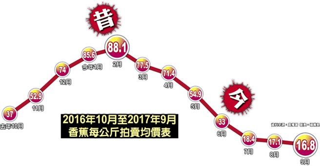 更糟糕的是,在产量上供过于求的台湾香蕉,还被质量欠佳的南部蕉拖累了拍卖价,转眼间,这香蕉价便呈现断崖式的坠落,现在一般收购市场仅给出了10元的贱卖价,还有的产地卖到每公斤1元的破盘价!