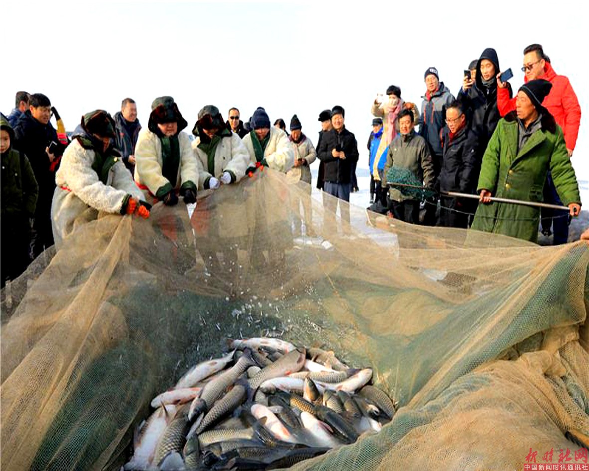 1月12日,在冰雪严寒的新疆博斯腾湖冰面上,举行了盛大的博斯腾湖冬捕仪式。冬捕仪式后一群身着翻毛大衣和长筒水靴的渔家壮汉们,在绞网机的牵引下,将大网缓缓拉出,活蹦乱跳的大鱼争先恐后跳上了冰面,博斯腾湖冬季巨网捕鱼第一网就捕捞出了2.5吨多的鲜鱼。