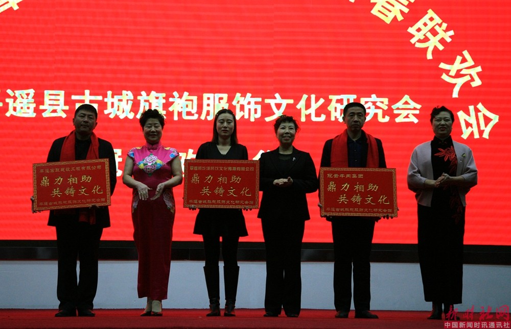 古城旗袍服饰文化研究会副会长王玉兰、赵加花、左新花代表研究会赠与冠云牛肉集团、平遥宏政建设有限公司、平遥親圪墶餐饮文化传播有限公司“鼎力相助 共铸文化”牌匾