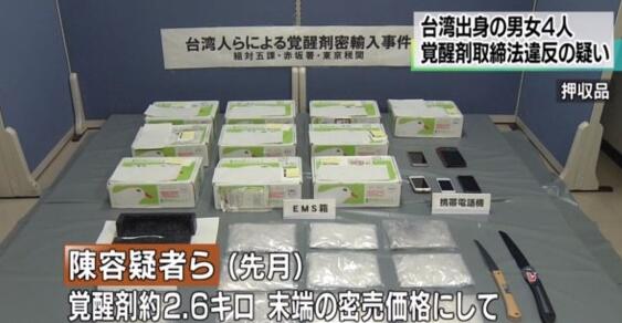 4名台湾人涉嫌上个月在日本走私2.6公斤、市价约1.6亿日元的毒品,遭到日本警方逮捕,据台自由电子报30日报道,由于近年来,台湾偷渡毒品到日本的案件增加,日本警方怀疑全案可能是组织性犯罪,将扩大调查。