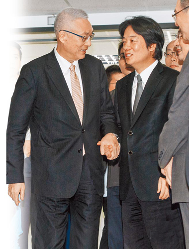 台当局行政院长赖清德(右)3日拜会国民党主席吴敦义(左),两人在吴敦义办公室外笑容满面握手致意,随后两人手牵手步入会议室。(图片来源:台湾《中时电子报》)