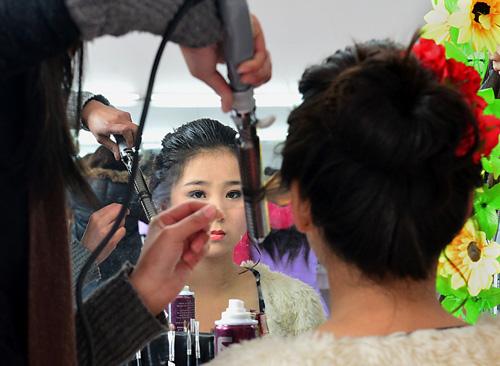 资料图片:在一个美容美发培训班上,学员们在上实习课。新华社记者王颂摄
