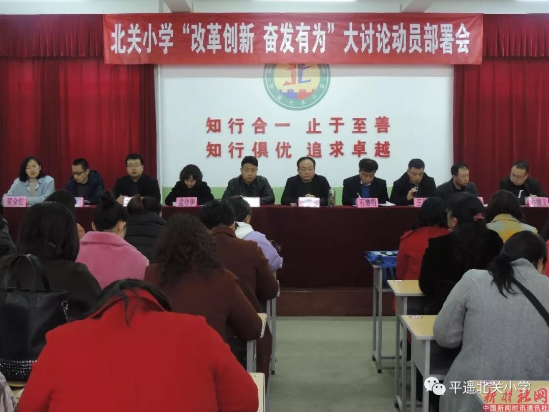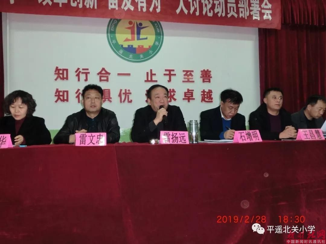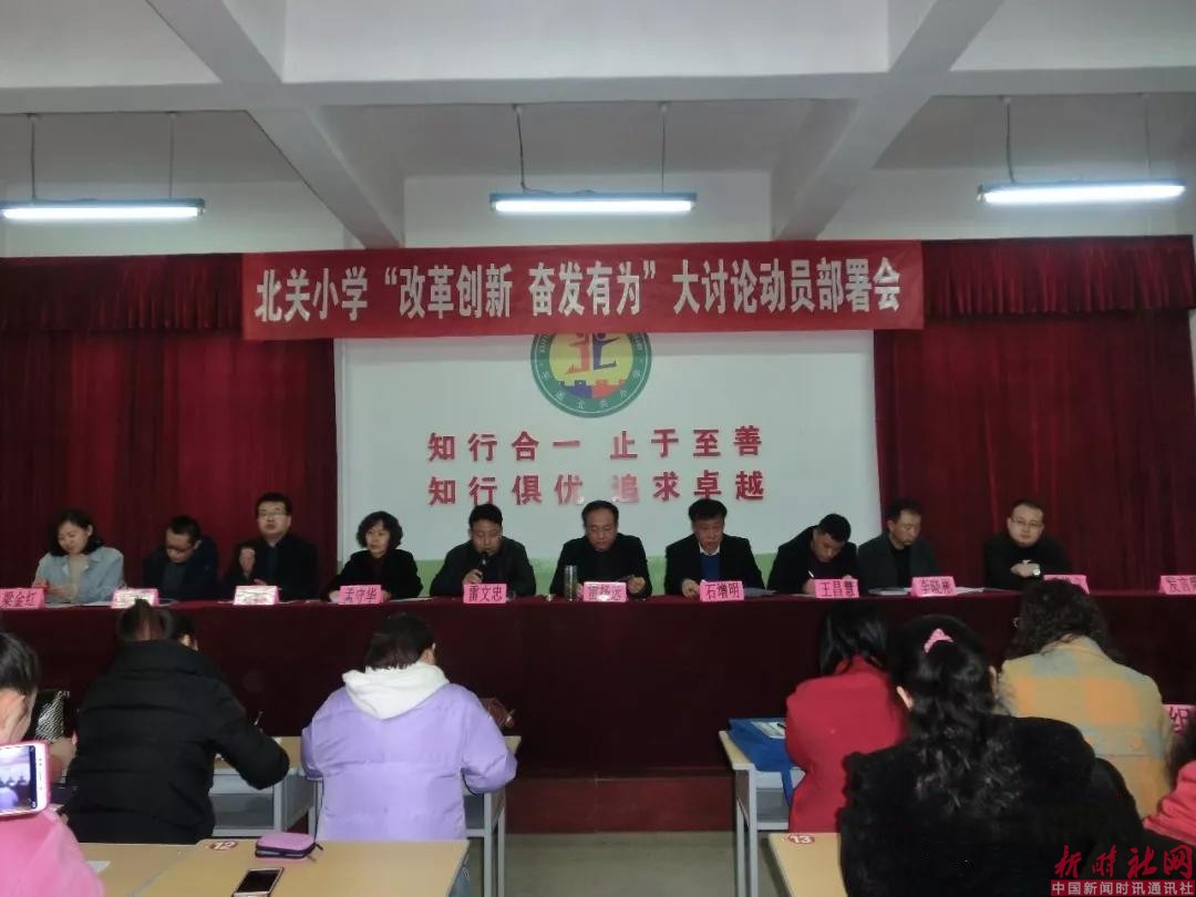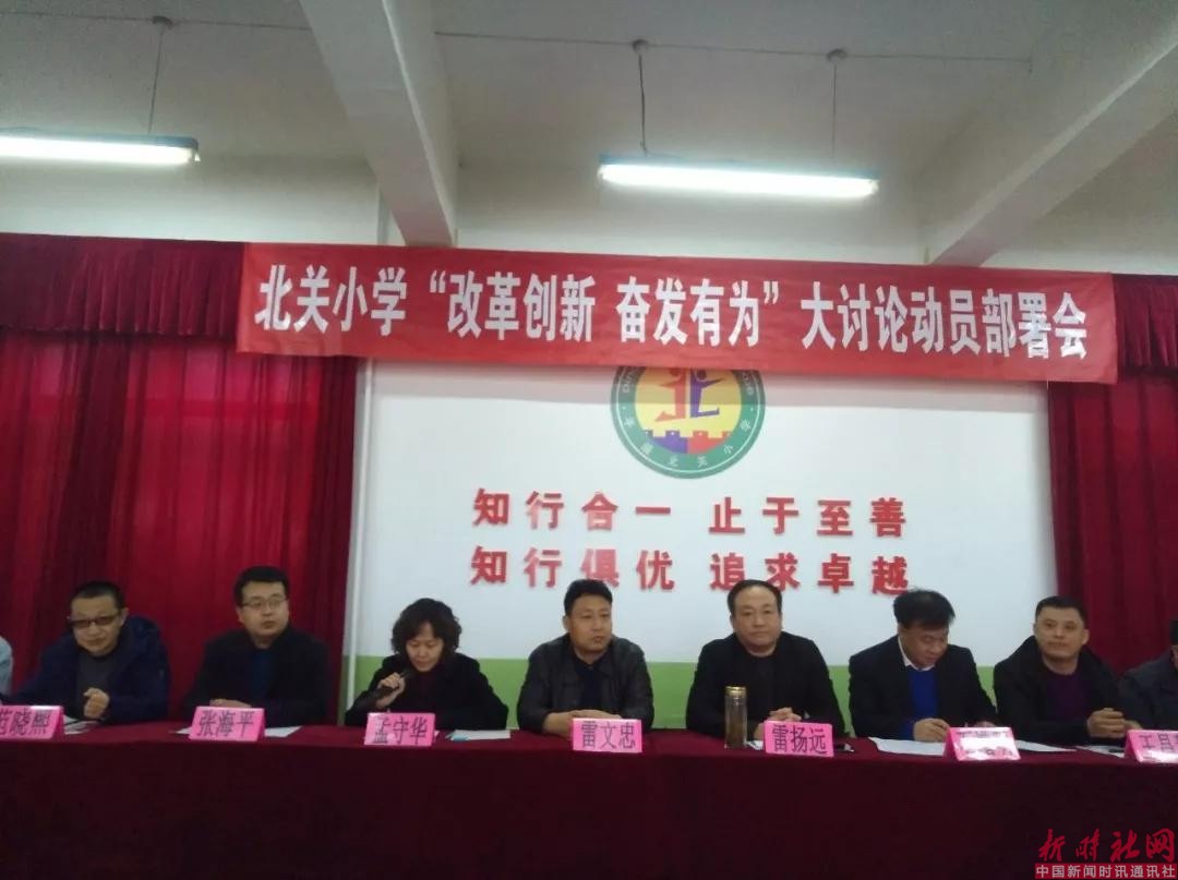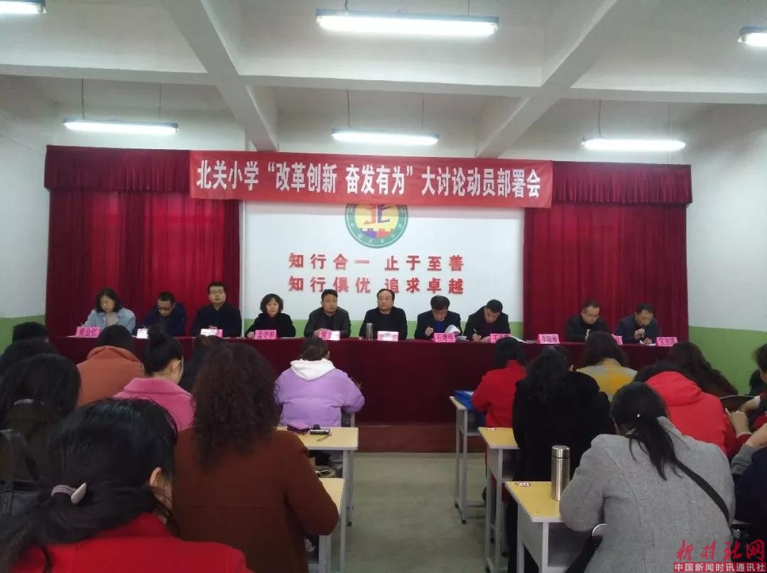 山西站采编部讯:2月28日下午,北关小学全体教职工在会议室召开“改革创新、奋发有为”大讨论动员部署会,会议由孟守华副校长主持,李晓彬副校长宣读大讨论的实施方案,雷文忠校长做动员讲话,两个校区相关领导及班主任代表分别作了表态发言,教科局督察组领导雷扬远副局长和督察组成员石增明参加会议。