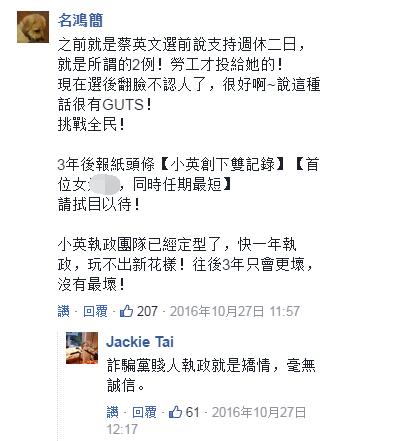 侃爷记得在2016年10月5日那天,蔡英文是这么说的:上任以来,从化解高速收费员争议、提高基本工资到落实七休一,每一项都显示我们对增加劳工实质利益的努力。可现在呢?提高基本薪资是做到了,但高速收费员近期被开罚、七休一如今要被松绑,还能说是保障劳工吗?