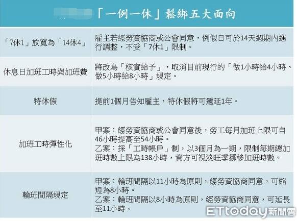除了松绑七休一外,台劳动部也打算取消现行做1算4做5算8的加班费规定,改依实际时数计算。另外,还有延长工时上限特休假递延轮班间隔等五大方面的新举措。