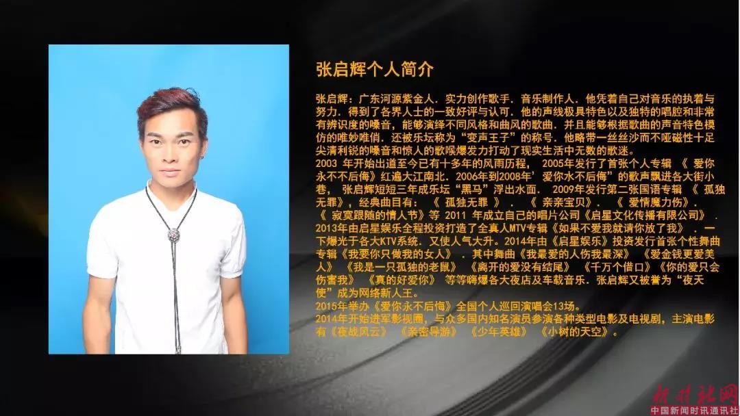 张启辉:广东河源紫金人.实力创作歌手.音乐制作人.他凭着自己对音乐的执着与努力.得到了各界人士的一致好评与认可.他的声线极具特色以及独特的唱腔和非常有辨识度的嗓音,能够演绎不同风格和曲风的歌曲.并且能够根据歌曲的声音特色模仿的唯妙唯俏.还被乐坛称为“变声王子”的称号.他略带一丝丝沙而不哑磁性十足尖清利锐的嗓音和惊人的歌喉爆发力打动了现实生活中无数的歌迷。