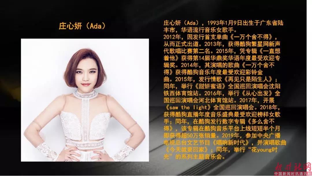 庄心妍(Ada),1993年1月9日出生于广东省陆丰市,华语流行音乐女歌手。2012年,因发行首支单曲《一万个舍不得》,从而正式出道。2013年,获得酷狗繁星网新声代歌唱比赛第二名。2015年,凭专辑《一直想着他》获得第14届华鼎奖华语年度最受欢迎专辑奖。2014年,其演唱的歌曲《一万个舍不得》获得酷狗音乐年度最受欢迎彩铃金曲。2015年,发行情歌《再见只是陌生人》;同年,举行《甜妍蜜语》全国巡回演唱会沈阳铁西体育馆站。2016年,举行《从心出发》全国巡回演唱会河北体育馆站。2017年,开展《saw the light》全国巡回演唱会。2018年,获得酷狗直播年度音乐盛典最受欢迎榜样女歌手;同年,在酷狗发行数字专辑《多么舍不得》,该专辑在酷狗音乐平台上线短短半个月即获得超50万张销量。2019年,参加中央广播电视总台文艺节目《唱响新时代》,并演唱歌曲《今天就要回家》;同年,举行“花young时光”的系列主题音乐会。