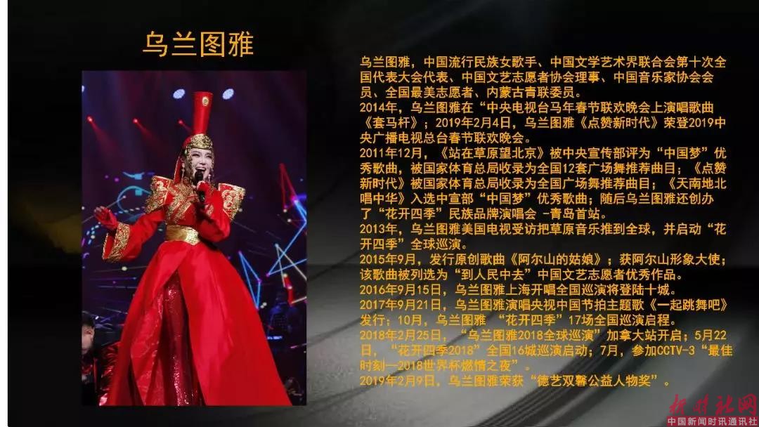 2014年,乌兰图雅在“中央电视台马年春节联欢晚会上演唱歌曲《套马杆》;2019年2月4日,乌兰图雅《点赞新时代》荣登2019中央广播电视总台春节联欢晚会。