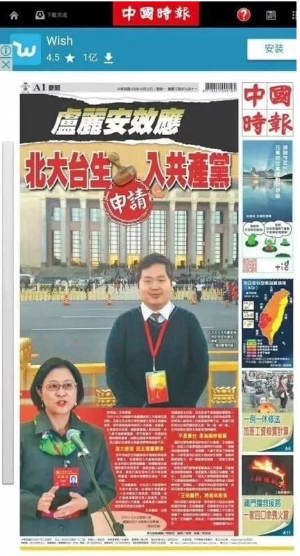 近日台湾《中国时报》在头版头条刊登了北大台生王裕庆申请加入共产党的报道,并称这是卢丽安效应 。