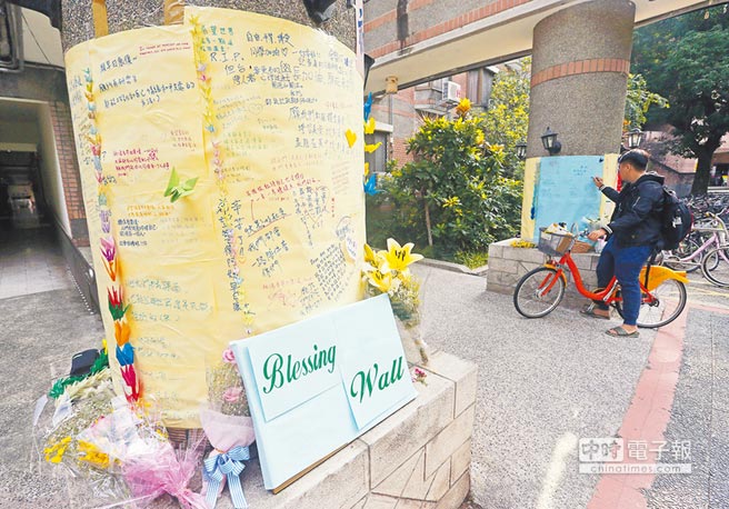 在台湾大学校园泼酸案的现场,校方曾在事发的宿舍外立起祝福墙让校内师生写下祝福的字句。据最新了解,被害人谢姓学生上半身已全部碳化、呈焦黑状,脸部五官难辨,至今还住在台大医院加护病房。(图片来源:台湾《中时电子报》)