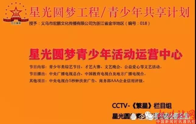 上半年举办CCTV繁星.星光圆梦青少年才艺大赛;2019年下半年举办CCTV繁星.星光圆梦青少年春晚选拔赛;暑假举办清华北大研学旅游、建国70周年全国青少年文艺晚会及2020年中央电视台、中国教育台两大青少年春节晚会等。现面向全国征集上半年CCTV繁星.星光圆梦青少年才艺大赛及下半年CCTV繁星.星光圆梦青少年春晚节目选拔赛各地区代理商,优秀选手推送给中央电视台银河少儿艺术团及CCTV大风车艺术团。