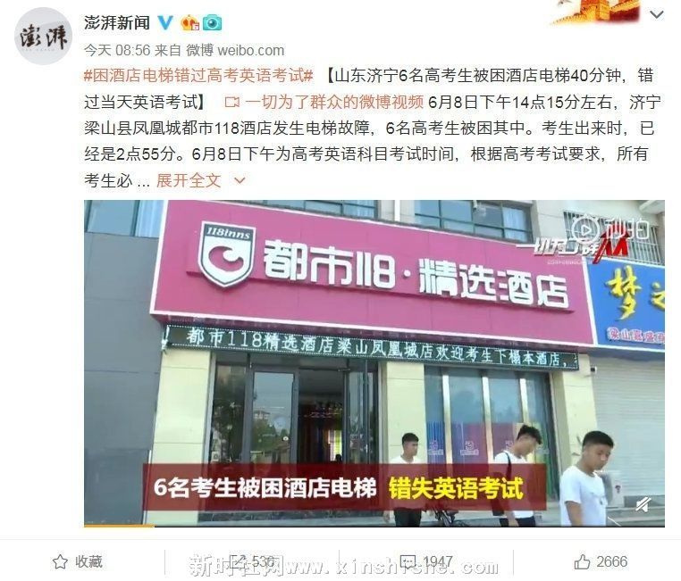 6月8日下午14点15分左右,山东济宁梁山县凤凰城都市118酒店发生电梯故障,6名高考生被困其中。考生出来时,已经是2点55分。6月8日下午为高考英语科目考试时间,根据高考考试要求,所有考生必须于14:45前进入考点。考生已错过了入场时间,不能进入考场,未能参加外语科目考试。其中一名考生家长告诉记者,酒店负责人当时说,要赔偿他们每人5000元。家长们没有同意。6月10日、11日接连两天,家长们又到酒店讨说法,酒店负责人都没有露面。梁山县委宣传部表示,将由教育部门协调误考学生补习复读。