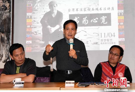 中华台北书法家协会监事主席、台湾少数民族书法家谢石鸿为书法爱好者作书为心宽书法讲座。 记者刘可耕 摄