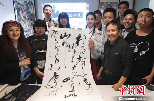 台湾少数民族书法家谢石鸿与书法爱好者互动交谈。 记者刘可耕 摄