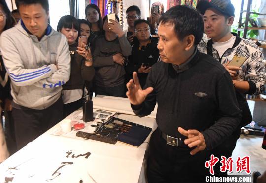 台湾少数民族书法家谢石鸿现场挥毫题写书法作品。 记者刘可耕 摄