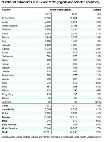 而预期未来几年全球百万富翁将表现亮眼。目前全球有3600万名百万富翁,2022年前预料人数会成长到4400万人。其中,美国依旧是全世界拥有最多百万富翁的国家,身家超过100万美元的富豪有1530万人。