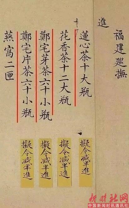 其次,作为贡品,郑宅茶也深为皇室所珍爱。据乾隆年间《内务府奏销档案》记载:郑宅茶二匣。乾隆皇年六月《总管内务府奏销文件》记载为例,各地进贡茶叶多达六十余种。其中,乾隆皇帝最为喜爱的有武夷茶、郑宅茶等,其中武夷茶和郑宅茶尤为珍爱。以雍正七年(1729年)为例,全年皇帝赏赐云贵总督鄂尔泰共8次,赏赐物品有对联、吉祥十字、珍珠、茶等几十种。其中,“五月赏赐郑宅茶二匣,润七月赏赐莲心茶二瓶、茶膏一匣。”河东总督田文镜为赐茶谢恩事奏折,“皇上赐臣郑宅茶四小瓶,臣随跪迎进内恭设香案望”此奏折原件还保存在国家第一档案馆,