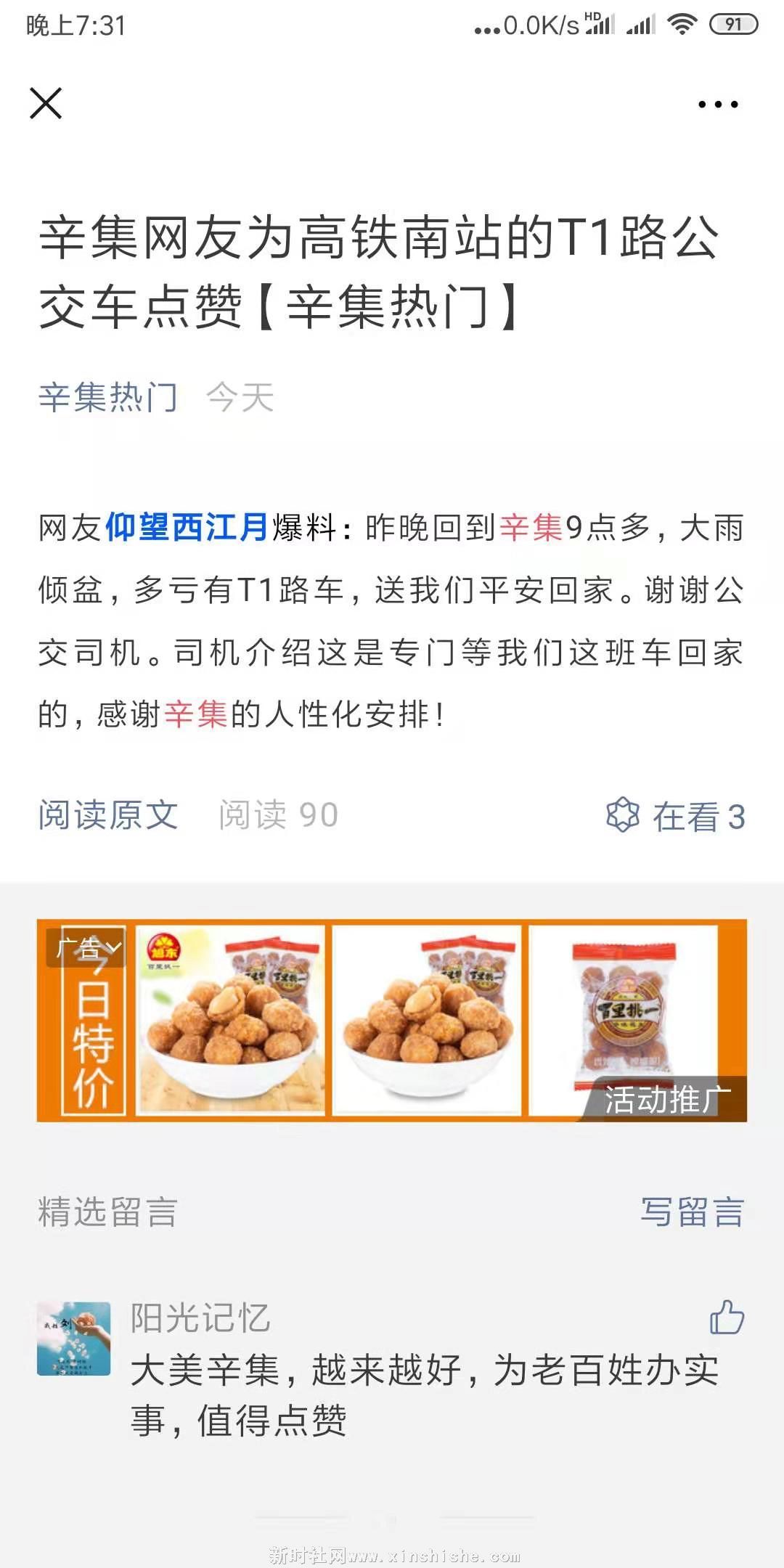 近日由于辛集高铁南站又增加一列高铁D1643,正点到达辛集高铁南站的时间是晚上的21:14分。由于这个时间公交车已经停运,下车的旅客只能打出租车回家,而且车辆又少加上南站又偏僻。在辛集市委及河北鑫轩运输股份有限公司辛集公交分公司的领导大力支持下,每晚在这个时间安排一辆T1路专门接送这列高铁下车的旅客,这一举措得到了广大旅客的好评。并为河北鑫轩运输股份有限公司辛集公交分公司这一利民举措点赞。