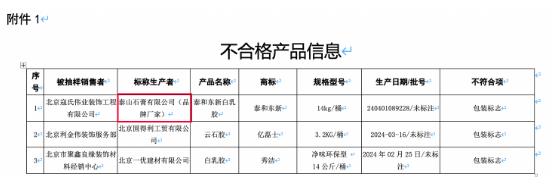 此外,除了防水卷材产品,北新建材旗下泰山石膏有限公司生产的泰和东新白乳胶在今年8月北京市市场监督管理局的质量监督抽查中,因包装标志不符合标准上榜。