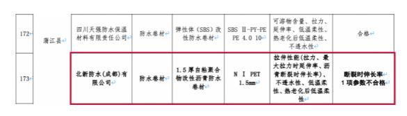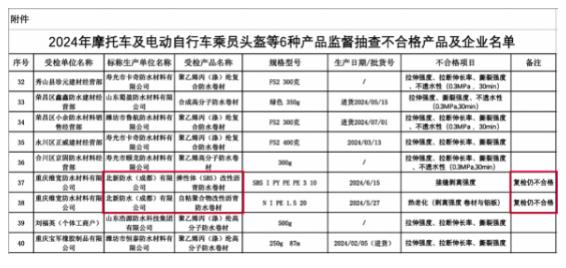 据媒体综合消息,11月25日,重庆市市场监督管理局发布“关于2024年摩托车及电动自行车乘员头盔等 6种产品监督抽查情况的通告”,其中由北新防水(成都)有限公司生产的弹性体改性沥青防水卷材、自粘聚合物改性沥青防水卷材分别因接缝剥离强度、热老化指标被爆不合格,且在复检中仍不合格。
