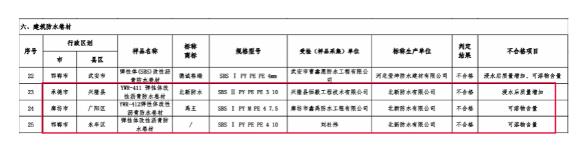 10月30日,河北省市场监督管理局发布《关于家用燃气灶等产品质量监督抽查结果的通告》,其中北新防水生产的三款产品防水卷材抽检均不合格,不合格项为浸水后质量增加、可溶物含量不合格。其不合格产品流向涉及到承德、廊坊、邯郸等地。