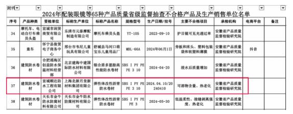 10月29日,安徽省市场监督管理局发布《关于2024年配装眼镜等65种产品质量省级监督抽查结果的通报》,通报显示,上海北新月皇新材料集团有限公司生产的弹性体改性沥青防水卷材主要不合格项目为“可溶物含量、热老化”。