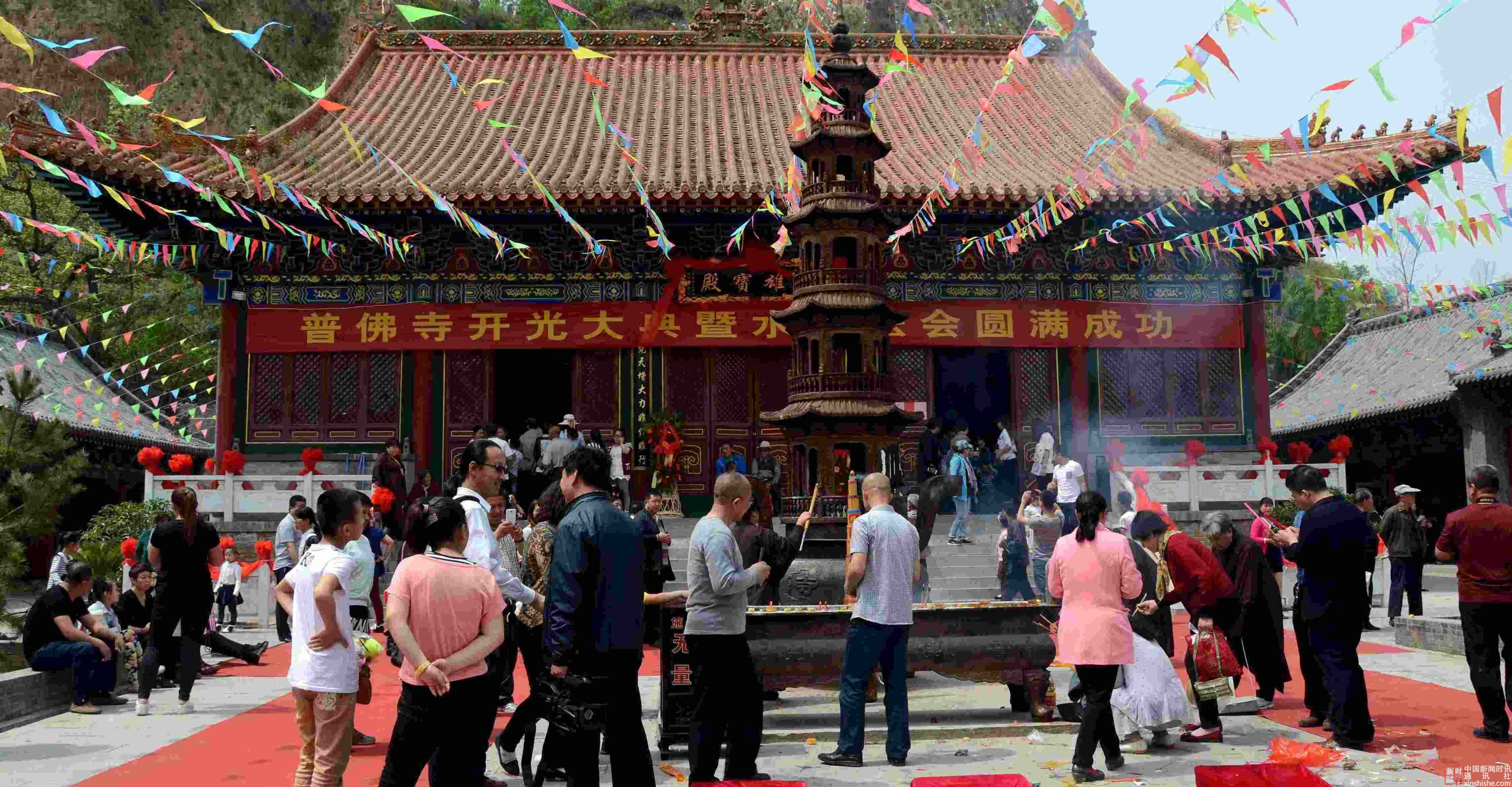玉泉山历史悠久、文化灿烂,东周列国时,中原八个诸侯国曾在此会盟;明朝末年,闯王李自成曾率农民起义军来到玉泉山拜祷。普佛寺坐落在玉泉山上,依山势而建,布局严谨,层次分明,错落有致,建筑宏伟,古朴典雅,堪称古建筑中的精品,周围山峦起伏,绵延数十里。寺院兴建于南北朝,距今有1500多年历史,原名静乐寺,历经元、明、清多次修葺和扩建,寺院规模宏大,占地50余亩,有各种建筑200余间,分上、中、下三院。寺内殿阁巍峨,金碧辉煌,法象庄严,佛教气息浓郁,各殿之间迂回曲折,小径通幽,漫步寺间,听飒飒松风,给人一种静寞幽深的感觉。