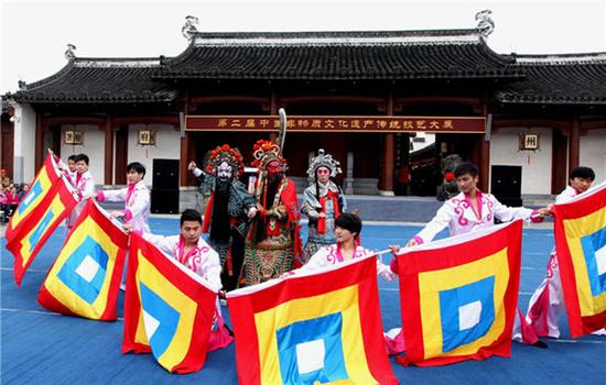 开幕式现场,一首徽州小曲《牧牛山歌》引爆全场,徽剧《百花赠剑》、《游湖》、《水淹七军》等古朴天然的徽州民间文化节目也吸引了众人目光。精彩节目暖场后,黄山区的轩辕车会、歙县叶村的叠罗汉和休宁的得胜鼓作为徽州特色文化展演惊艳亮相,赢得阵阵掌声。