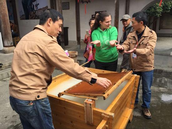 在徽州撕纸技艺展示台前,省级非遗传承人蒋劲华将一片片纸变成一个个颇具艺术的文字。一位参观的专家向蒋劲华提出撕纸要求,蒋劲华很快创作出一幅精美作品,围观来宾纷纷叫好。