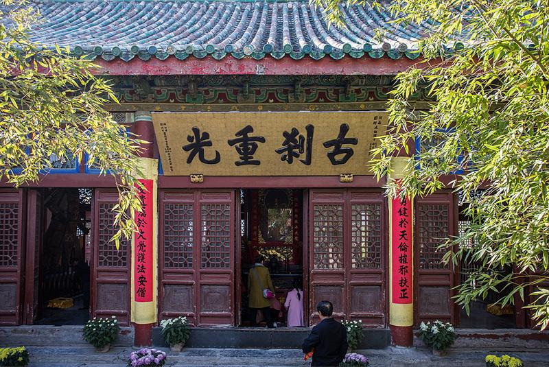 正殿为清建筑,重檐高耸,顶以黄绿琉璃瓦覆盖,殿与月台皆以白石栏环护,上下对比鲜明,益显色彩斑斓。八角琉璃殿俗称罗汉殿,高亭耸立于中央,游廊回护于四周,顶盖琉璃瓦,角悬迎风铃,造型别致,世所罕见。殿内有一尊四面千手千眼观音像、高约7米,全身贴金,乃清乾隆年间工匠用一棵大银杏树雕成,精美绝伦,巧夺天工。殿内还有12尊罗汉像,皆铜铸,形态各异,栩栩如生。