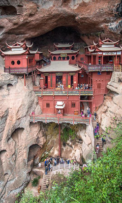 泰宁甘露岩寺位于福建省泰宁金湖西岸,长滩人形山西侧,是两个神奇的悬空寺之一,也是泰宁最负盛名的岩寺。甘露岩寺始建于公元1146年,距今已有850多年。岩穴高80多米,深和上部宽约有30多米,但下部宽只有10多米,呈倒三角形。古人把这地理上劣势变为建筑上的优势,采取“一柱插地,不假片瓦”的独特结构建筑,即一根粗大的柱子落地,撑托起了四幢重楼叠阁屋顶无需用片瓦,全部建筑木质的,分上殿、蜃楼阁、观音阁、南安阁四部分组成,没有用铁钉,工艺精湛,巧夺天工,雕梁画栋,别具一格,是我国建筑史上一大杰作,闻名中外。