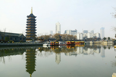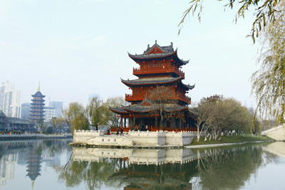 中洲公园内那高耸的楼阁便是清江浦楼。清江浦楼是岛上的标志性建筑,是中洲最靓丽的一道风景。清江浦楼的创意源于旧清江浦楼,旧楼位于老城西,临近古运河南岸,建于清雍正七年,是一座两层小楼,楼上四面有窗,楼下拱门可以通行,楼面有石刻“清江浦“三字,以此为清江水名和地名的标志。清朝在淮阴设清河县,旧楼地处县城繁盛区域,游人来这里,必登此楼,凭高远望,襟怀为之开阔,“半天虚籁磬声落,一片夕阳帆影来”,歌咏的就是清江浦楼。周恩来总理童年时也常登此楼,俯瞰运河水色,仰观蓝天白云。现在我们已经来到扩建的清江浦楼的脚下。新楼建筑面积640平方米,楼高23米,明代风格仿古结构,五层楼阁(明三暗二),底层基座稳健厚重,明层出平台可凭栏观景,屋角冲三翘四,出檐深远,形象秀丽,屋顶十子脊,建筑造型丰富多彩,令人回味。