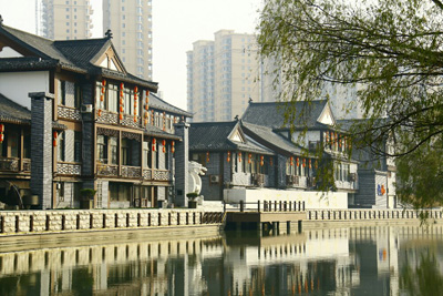 文化中心是中洲公园的主体建筑,面积9546平方米,建筑物若隐若现于绿化带中,宛若天成。建筑内部通过院落组织空间,以迂回起伏的长廊连通各房间功能,观赏游玩时,蜿蜒曲折,别开生面。建筑形式上采用淮安地方坡屋顶建筑特征,高跨比1:4,屋顶压脊,“一起三折”,屋顶搭接灵活,种类丰富,主体梁、柱、屋面采用仿古结构,外门窗皆为木结构,室内墙壁刷白,外墙采用小青砖贴面,具有浓郁的明清庭院风格。