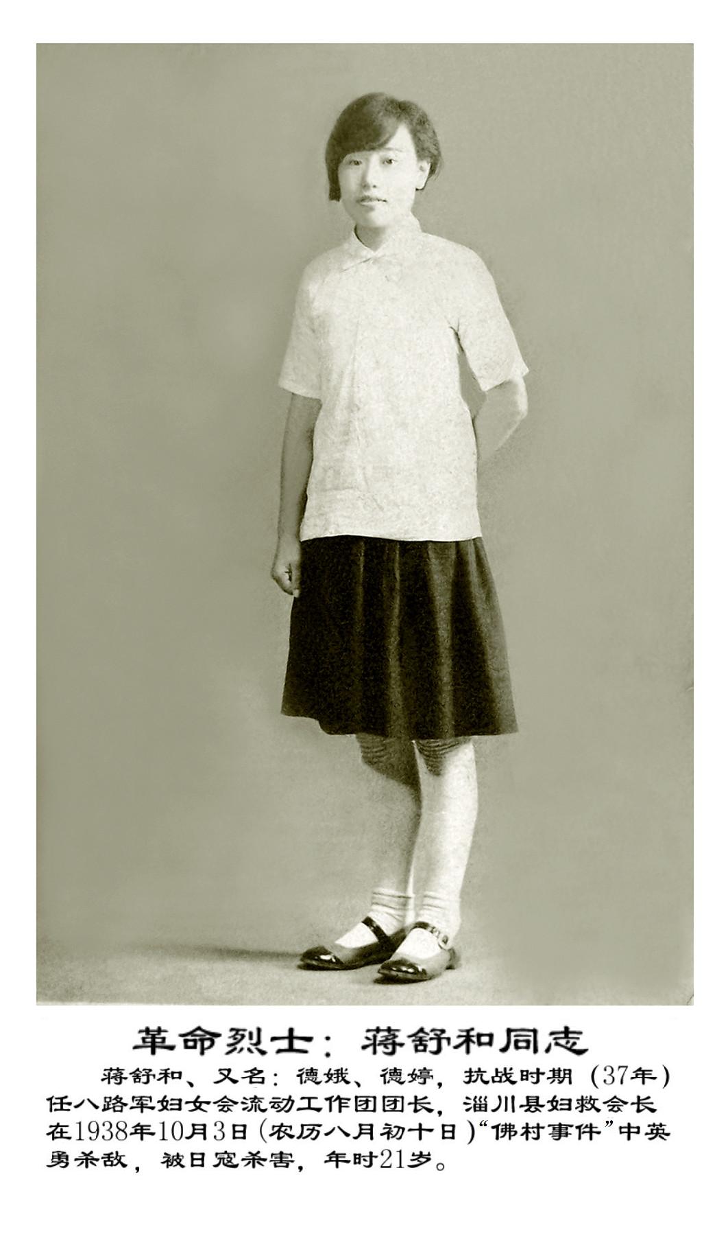每当听到或者看到与刘胡兰、赵一曼相关的文字图像,就会使我想起另一位像她们那样为国捐躯的勇敢女子,她就是鲜为人知的抗日英烈蒋舒和。