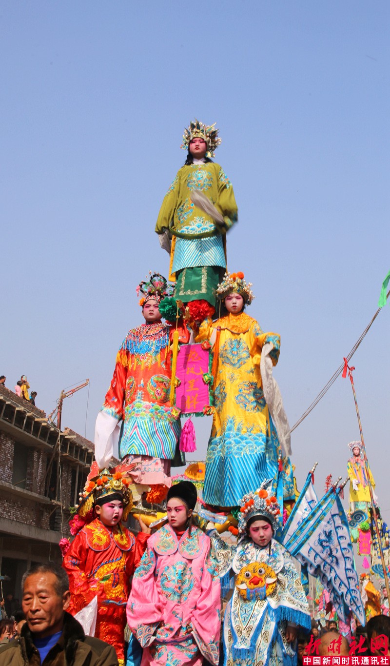 大装式样结构:下有拖挂装架,上有“弓”字型装柱,高度以高空无障碍通过为准,一般为6-7米,7-9名少年演员,身着戏装,分上中下三层固定站立。整体看上去造型美观,引人惊叹!惊险奇妙,肃目壮观。