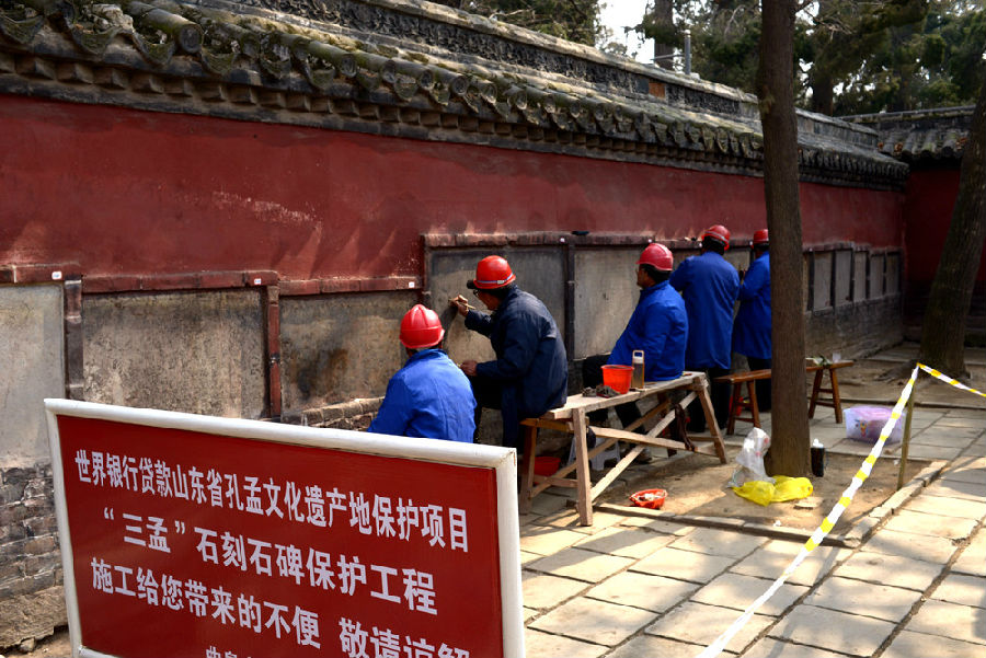 中国政府已从世界银行(以下简称“世行”)获得一笔贷款,用于支付山东省孔孟文化遗产地保护项目的费用,并计划将其中的一部分贷款用于支付: “三孟”石刻石碑保护工程。现修缮工作已全面展开。