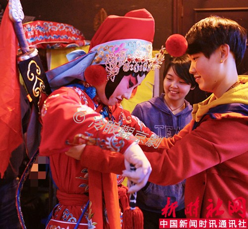 閆老師的學生吳奇峪(右)和劉山山(中)在演出前為老師整理服裝