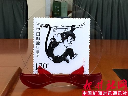 工作人员向我们展示铁画邮票“公猴摘桃”